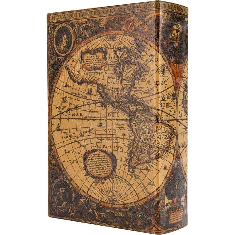 From the exterior the Antique Map Book Lock Box from BARSKA is made to look and feel like an antique bound book, but hidden inside is a concealed compartment for storing valuables. The compartment of the safe features a strong steel safe door that can be opened using one of the 2 included keys. The front cover of the book features a magnetic closure, ensuring that the Antique Map Book remains closed. This Book Lock Box blends easily in any home and is hidden in plain sight. Perfect for storing money, jewelry, passports, documents, and much more.