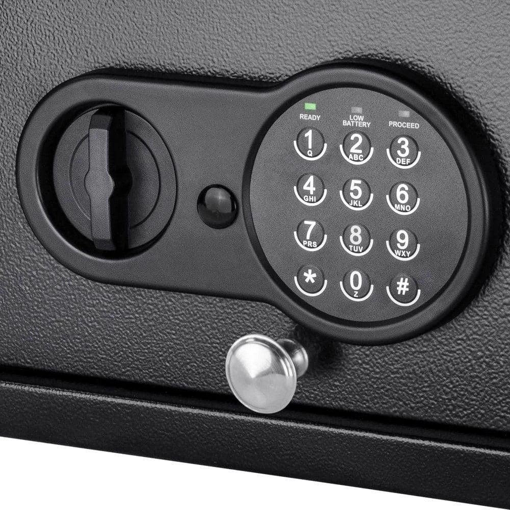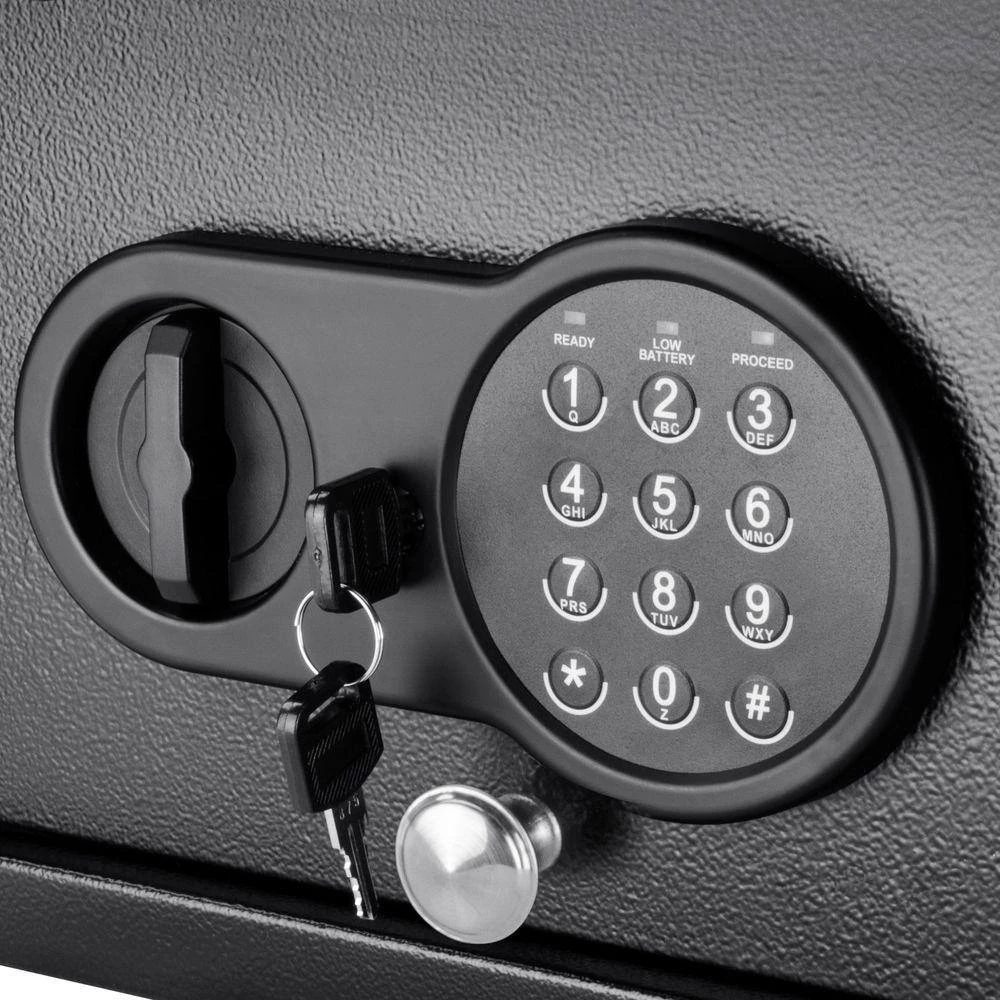 Keep valuables safe and secure with the Top Opening Keypad Safe by BARSKA. The compact dimensions of this safe allow it to be concealed in out-of-the-way places while providing enough storage space within to house multiple items. The user-friendly digital keypad retains 1-pin code for accessing the safe, and can also be opened with the included back-up keys. Two solid steel locking bolts provide extra security against tampering, and 4-mounting holes allow the safe to be secured to a flat surface.