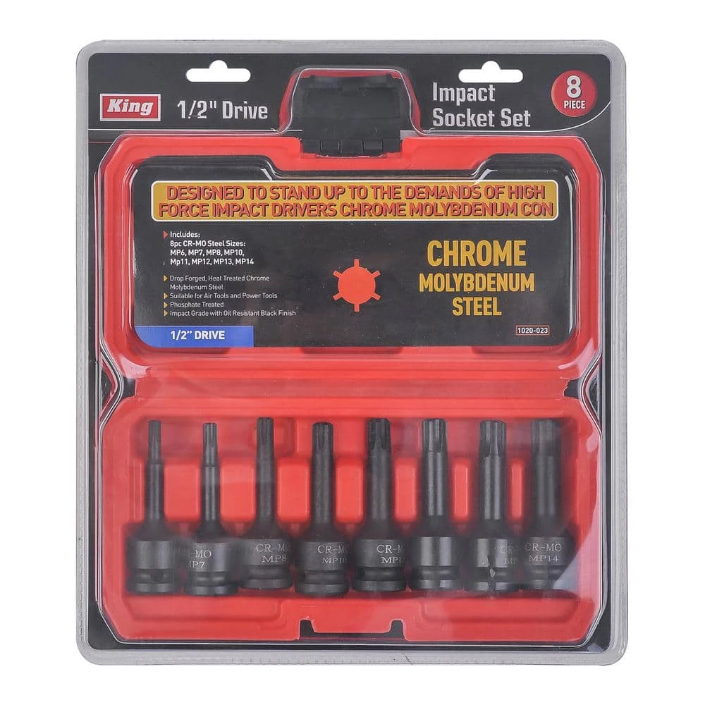 Product description KING’s 1/2 in. Drive Impact Polydrive Socket Set designed to stand up to the demands of high force impact drivers. Drop forged, heat treated chrome molybdenum steel. Sizes: MP6, MP7, MP8, MP10, MP11, MP12, MP13 and MP14.