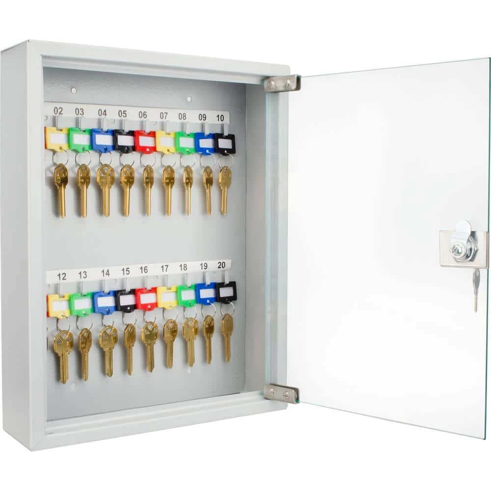 The 20-Position Key Lock Box from BARSKA features a hook-style cabinet that makes key 20-Position Key Lock Box from BARSKA features a hook-style cabinet that makes key organization easy and convenient. Included colored key tags allow the user to label each key for easy identification, and a glass door for quickly viewing the contents inside. The 20-Key Lock Box has 4 pre-drilled mounting holes and included hardware for installation. Ideal for home, office, apartment complexes, rental management companies, car lots, body shops, and many more. Backed by 1-Year Limited Warranty.