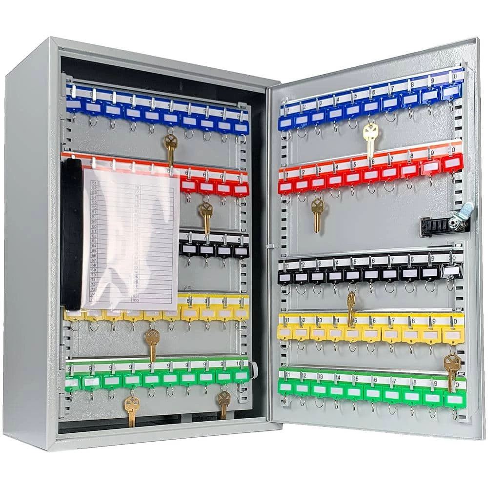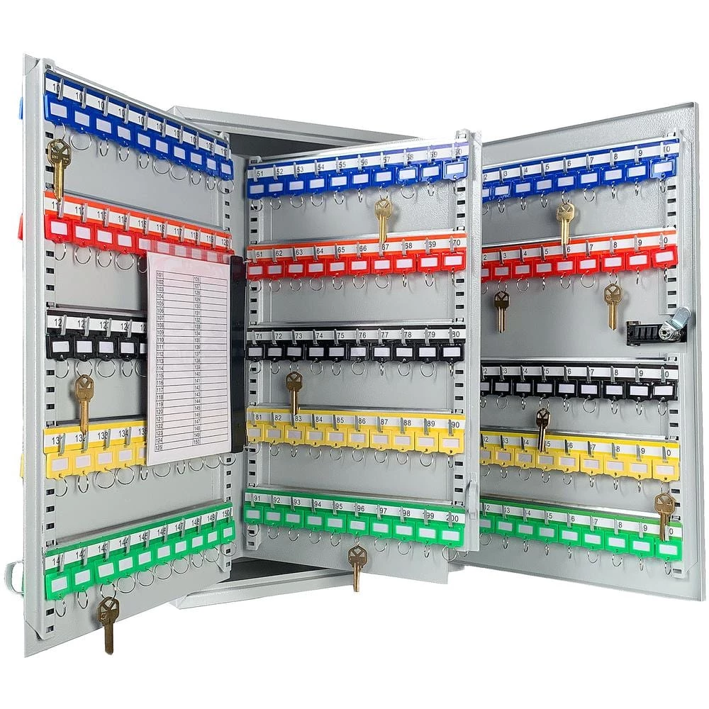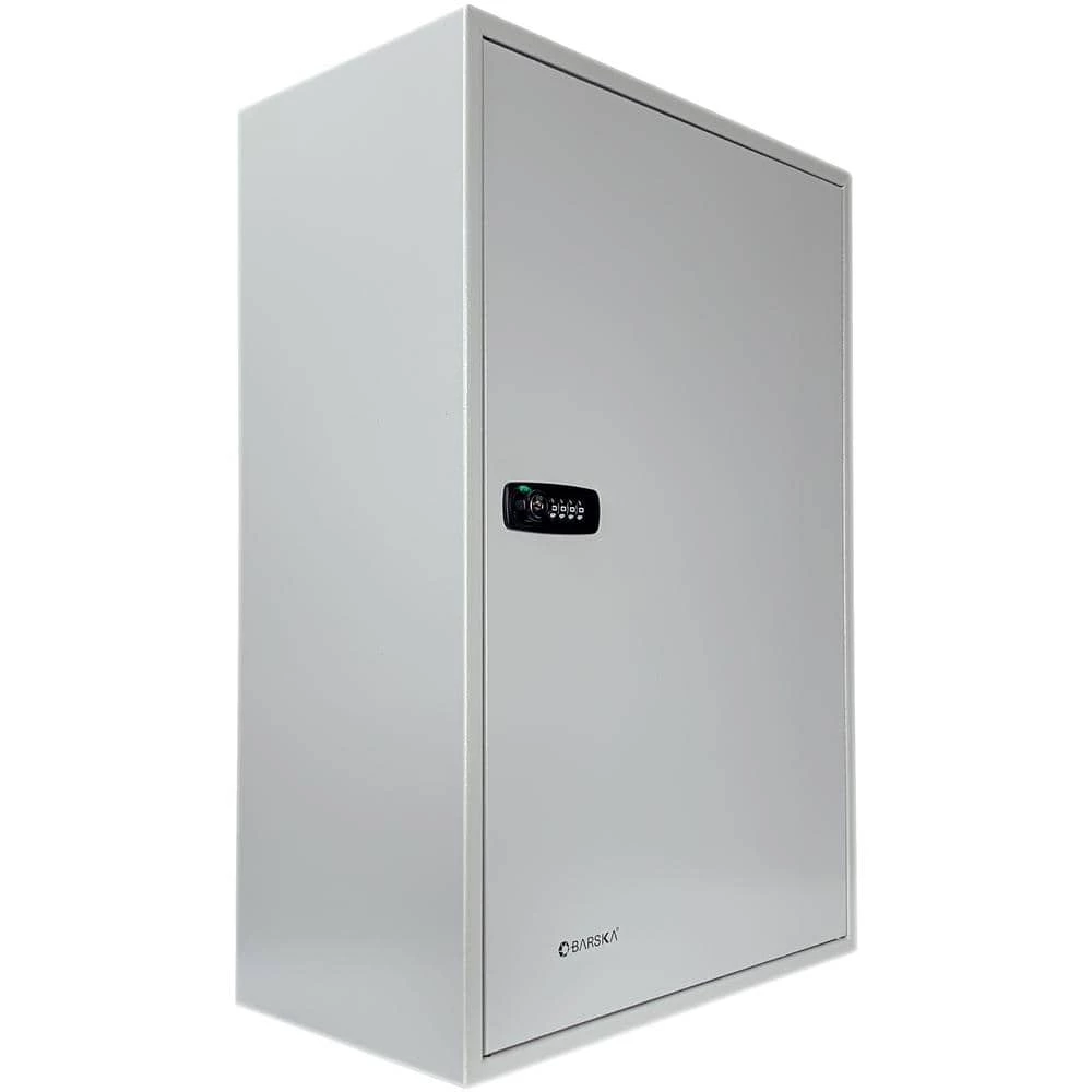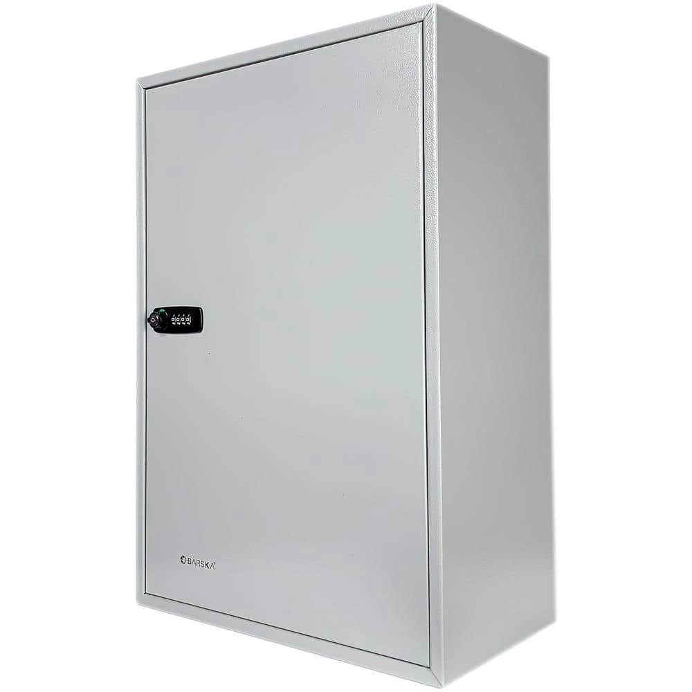 The 300 Keys Adjustable with Combination Lock, Grey by Barska features a hook-style cabinet that makes key organization easy and convenient. Inside the cabinet, are five rows of color-coded and numbered hooks, each of which are easy to access and to keep track of, thanks to the included key index. The two-sided index chart has ample room to document the keys hook position corresponding lock, and a drop-in plastic sleeve tethered to the hinge inside the safe provides a hands-free reference. The 300 Keys Adjustable with Combination Lock, Grey by Barska has pre-drilled anchor holes and including mounting hardware for quick installation. The safe’s exterior is constructed of 0.8mm solid steel and finished with a grey coating. This lock box is ideal for home, office, apartment complex, rental management companies, car lots, body shops, and many more. All Barska cabinets are backed by a One-year limited warranty.