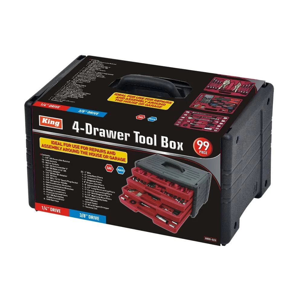 KING’s 99-Piece Combination Tool Set includes: an 8 in. crimping tool, 4-piece 4 in. screwdriver set with Phillips #1 and #2 and slotted 3/16 in. and 1/4 in., stubby ratchet handle, 6-piece precision screwdriver set with box, 8-piece hex key set with rack, terminal bag with 17 terminals, circuit tester, 8 in. water pump pliers, 8 in. adjustable wrench, 6 in. diagonal cutters, 6 in. L nose pliers, 6 in. combination pliers, 2-piece 4-1/2 in. mini pliers: diagonal cutter and long nose, 8-piece wrench set, utility knife with 5 blades, 2-piece 7 in. locking pliers set, 18-piece SAE/Metric 1/4 in. drive socket set, 12-piece SAE/metric 3/8 in. drive socket set, 3/8 in. drive ratchet, 1/4 in. male to 3/8 in. female adapter, 3/8 in. drive spark plug socket, 3/8 in. x 3 in. extension bar, 1/4 in. drive spinner handle, 1/4 in. drive coupler, 3/8 in. drive disc, 22-piece insert bit set and 4-drawer carrying case. Perfect for repairs and assembly around the house or garage. Comprehensive set of tools and accessories for general repairs. Modeled 4-drawer case for easy storage and mobility.