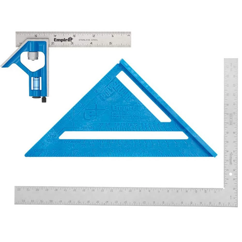 The Empire 6 in. TRUE BLUE Combo Square and 7 in. POLYCAST Rafter Square Kit (e255P) features 6 in. TRUE BLUE Combo Square precision machined working surfaces with rational head dimensions for a quick check of common measurements. The square features the BLADE-LOCK self-aligning draw bolt which allows users to make quick adjustments with a secure hold. The high visibility e-BAND Vials allows user to easily check level. The 6 in. etched stainless-steel blade will not fade over time and features high-visibility markings. The 7 in. POLYCAST Rafter Square is lightweight, durable, and can stand up to everyday use. The square features molded-in conversion tables. The Empire Framing Square is ideal for laying out and marking patterns in framing, roofing and stairway work. It features permanently stamped numbers and 1/8 in. graduations. 24 in. x 2 in. body, 1/16 in. thick. 16 in. x 1-1/2 in. tongue. Includes 1 Combo Square, 1 Rafter Square, and 1 Framing Square.