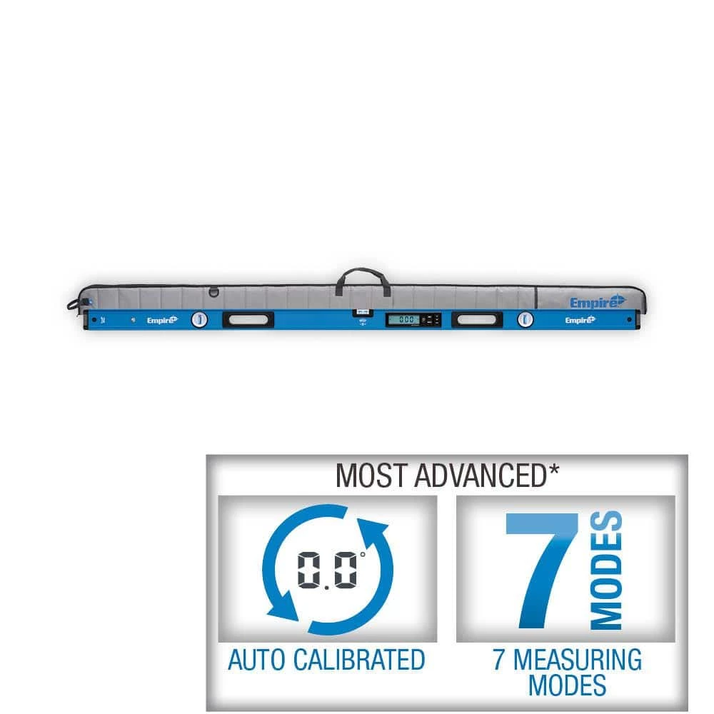 Digital Levels are a true testament to Empire’s commitment to world class accuracy, performance and innovation. The True Blue e105 Series Digital Level Offers Inspector Grade accuracy, superior protection and an advanced feature set. The e105 Series is the industry’s first Auto-Calibrated Digital Level for quicker set-up time and immediate digital readouts when the unit is powered on. Empire’s Digital Levels are engineered to provide fast and accurate readings in 7 different measuring modes and include large, easy to read dual backlit displays. For added durability, the True Blue Digital Level is IP65 Rated to protect against dust and water as well as extreme jobsite conditions. All 24 in.+ Digital Levels come with a protective storage case.