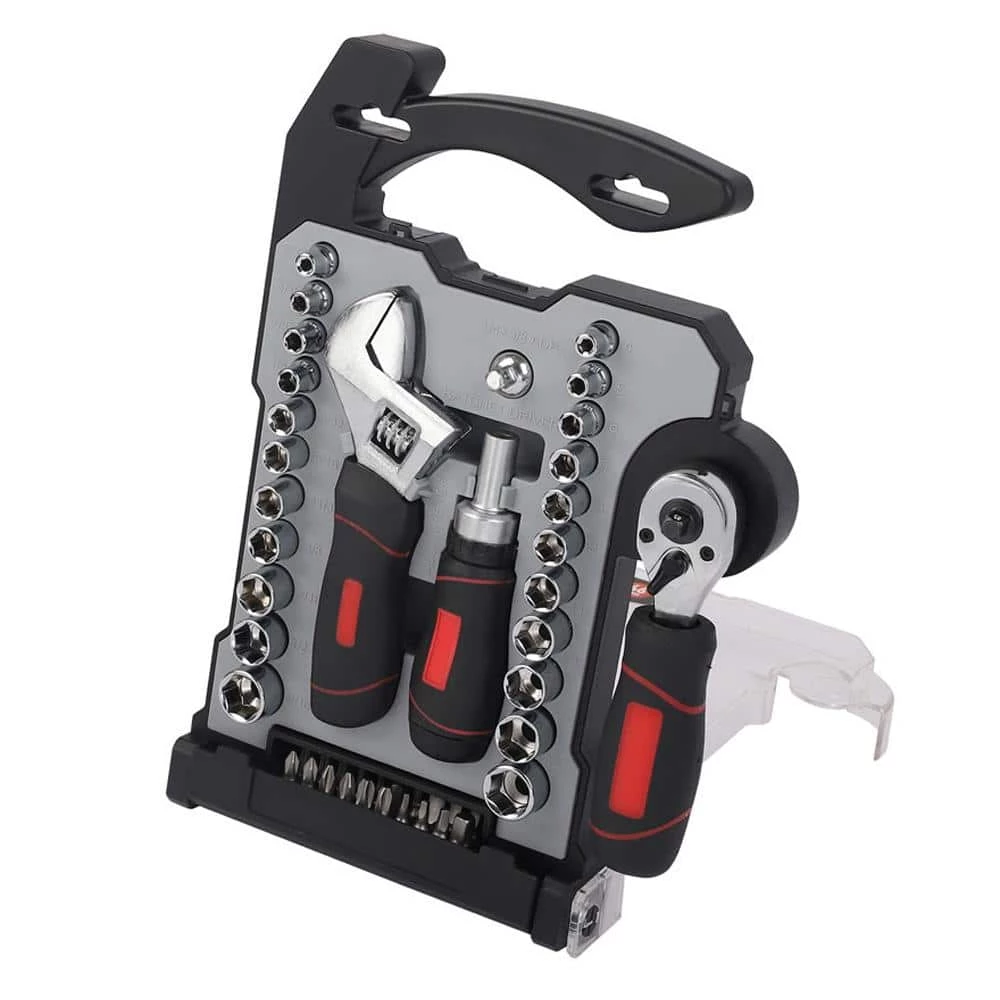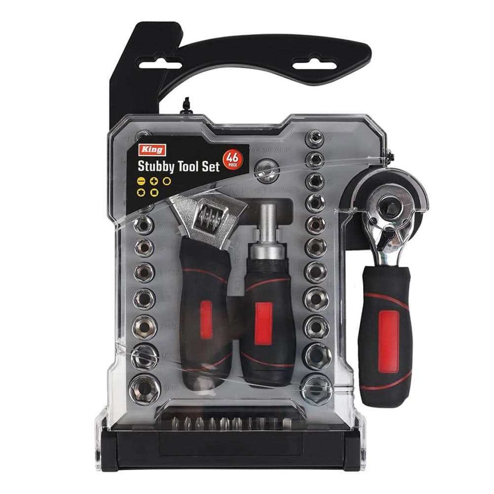 KING 46-Piece Combination Wrench and Socket Set features a complete set of tools perfert for all occasions and needs around the house, garage or office. It includes a dual drive ratchet, stubby adjustable wrench, stubby, ratcheting screwdriver handle, 1/4 in. DR SAE sockets, 1/4 in. DR metric sockets, 3/8 in. DR SAE sockets, 3/8 in. DR metric sockets, bit adaptor socket, screwdriver bits, 1/4 in. socket adaptor bit and carry case. Ideal for Working in Tight Spaces.