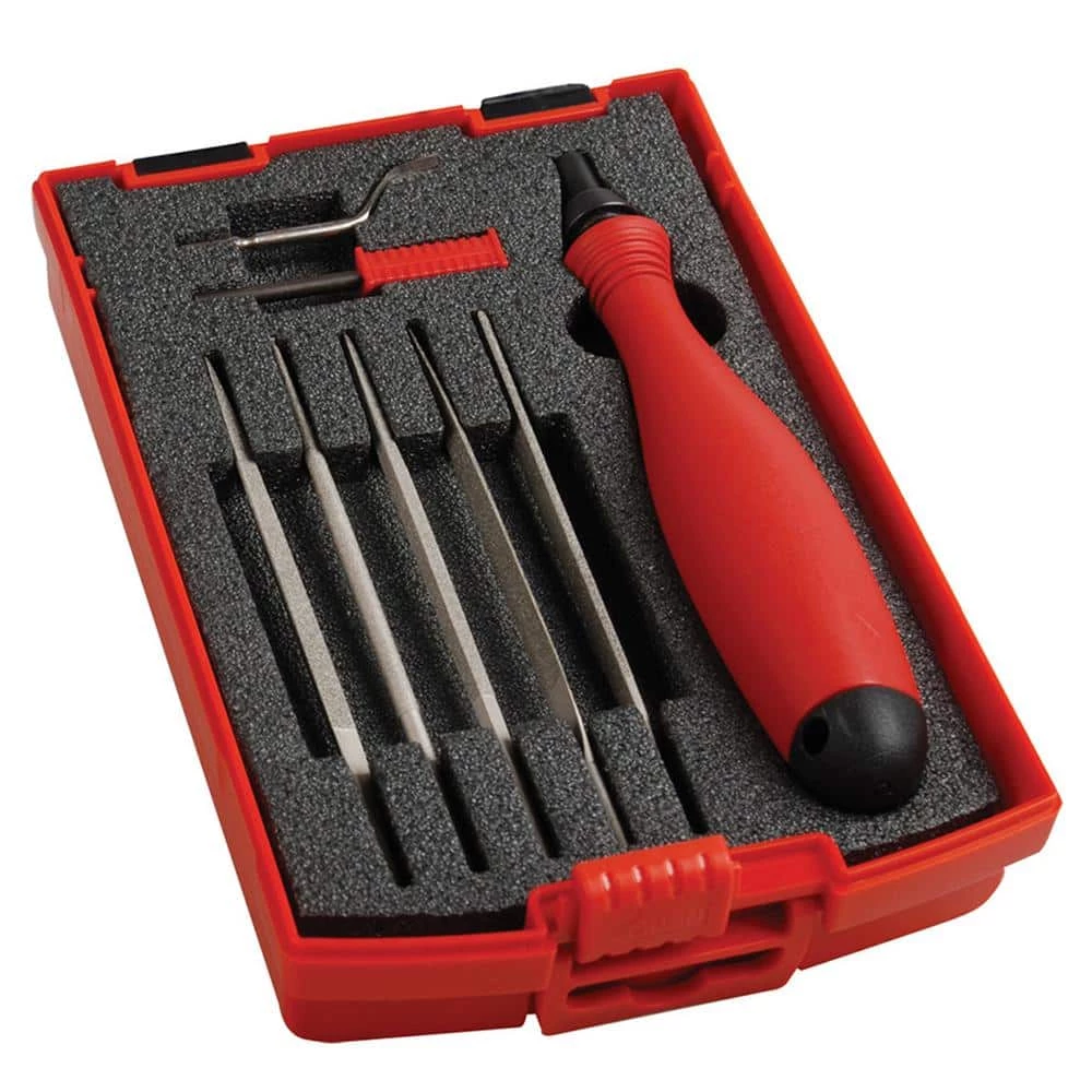 SHAVIV by Vargus is the original hand deburring tool in the market since the 1960’s and is today distributed all over the world. SHAVIV is the answer to unwanted burrs on a wide variety of materials such as metal, plastics, wood and more. Wherever the burr, SHAVIV has the tool in its extensive range to solve your problem. Look to SHAVIV for the tools to do the finishing problems that a machine just can’t handle. With SHAVIV there is no downtime, so you increase your productivity. SHAVIV Part 90109 Set Includes 1 MB2020E Handle, E100S Blade, E400 Blade and 5 styles of diamond coated blades.