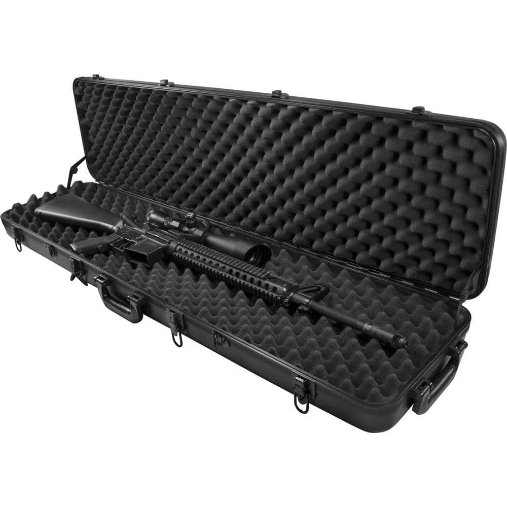 The Loaded Gear AX-300 hard rifle case is designed to carry up-to 45 in. long rifles or shotguns. This protective hard travel container features 2-crushproof handles and 2-built-in solid wheels for transport. With 4-key latch locks and 2-point padlock adaptable fittings, this case offers above standard security protection. The rigid ABS and black aluminum frame offers added reinforcement to the exterior of this protective rifle case. The Loaded Gear AX-300 rifle case includes 2-layers of removable egg crate foam. The interior of the case is also lined with shock absorbing foam liner. Built into the rifle case are interior locking hinges to ensure that the case stays open for easier access.